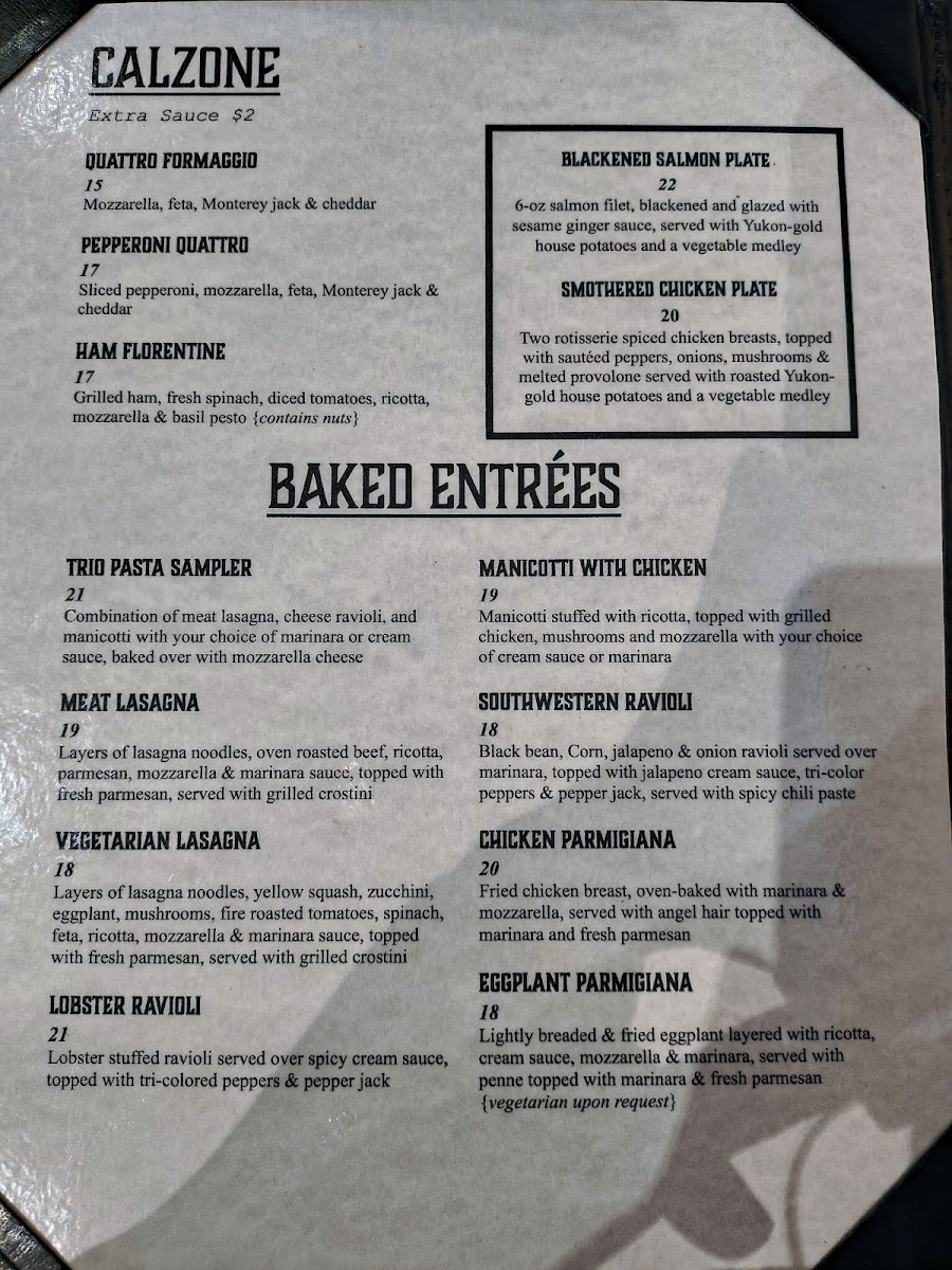 Black bean, corn, jalapeño, and onion ravioli (12) served over marinara, with jalapeño cream sauce, tri-colored peppers, pepper jack