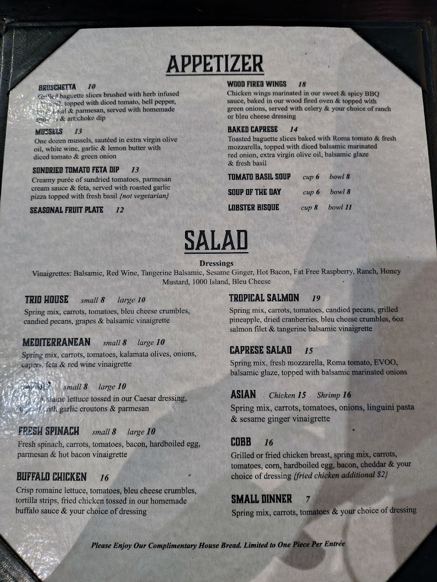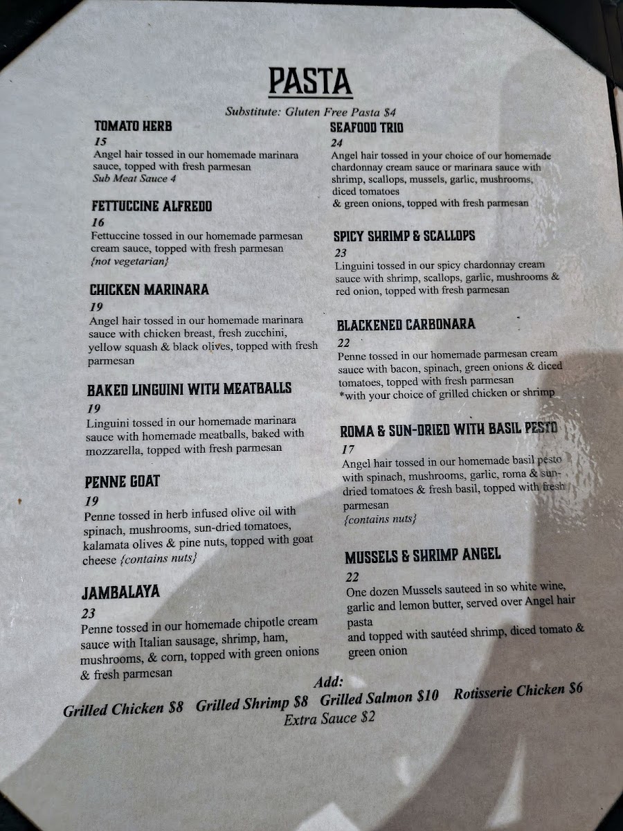Angel hair pasta tossed in either our homemade marinara sauce or our chardonnay cream reduction with shrimp, scallops, mussels, mushroom, diced tomato, green onions & garlic, topped with fresh parmesan